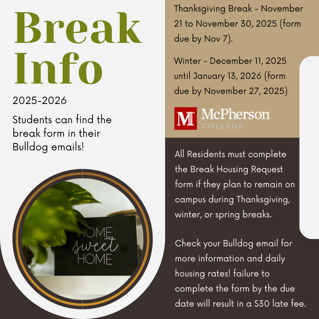 The Housing and Residence Life team at McPherson College is responsible for the daily operation of each hall and to ensure the students within campus housing are happy, healthy, and safe. Each hall has student staff known as Lead Resident Assistants, Resident Assistants (RAs), and Assistant Resident Assistants. The RA is a resource and program person who works with the residents on a daily basis. RAs are intended to build community in their halls. Please contact housing@mcpherson.edu if you have any questions or concerns!